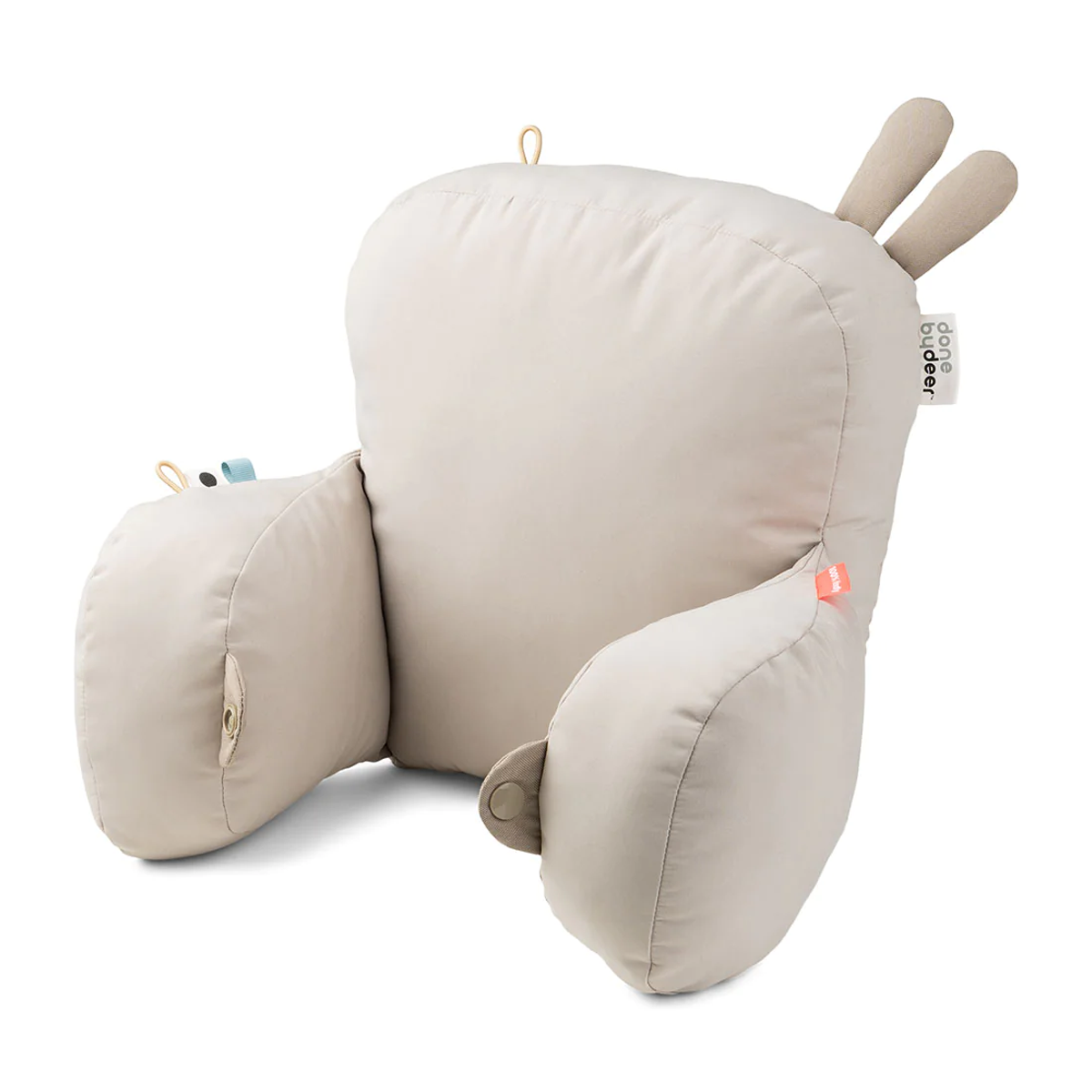 Når baby fra 6 måneders alderen begynder at kunne sidde op i barnevognen, er en barnevognspude en rigtig god idé. Denne smarte barnevognspude fra Done by Deer giver baby en god støtte i ryggen og sørger for, at baby ikke så let glider ned. På puden er fastgjort små sjove dimsemærker samt en løkke, hvori sutten eller yndlingslegetøjet kan fastgøres. Har baby brug for ekstra støtte, kan siderne på puden knappes sammen om baby, så der er støtte fra alle sider. Puden er også perfekt til leg på gulvet, hvor baby kan bruge den som støtte, hvis balancen endnu ikke er helt på plads. Kan vaskes i maskine ved max 40°C. Tåler ikke tørretumbler. Materiale: 100% polyester. Fyld: 100% genanvendte polyesterfibrer Mål: 27 x 25 cm. Anbefalet alder fra 6 mdr. Se alle varer fra Done by Deer