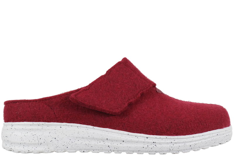 NEW FEET. Mørkerød hjemmesko fra New Feet til dame. Hjemmeskoen har en velcrostrop til regulering af pasformen. Overdelen er lavet i slidstærkt filtet uld. Ydersålen er lavet i PU med let gængefunktion. Inde i hjemmeskoen er der placeret en udtagelig 6 mm. stødabsorberende Protektor® indlægssål, som beskytter og aflaster foden. Læstegruppe W/81 .. Læs mere på https://www.juul-sko.dk/damesko/dame-hjemmesko/new-feet-16055-str38.htm