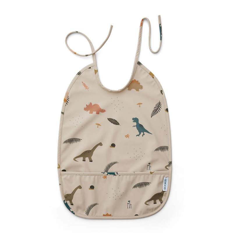Sød og praktisk hagesmæk med lomme fra Liewood. Hagesmækken er i fin sand-farve med fint print af seje dinoer blandt planter og blade. Materialet er let, blødt og vandafvisende og kan nemt tørres af med en fugtig klud. Lukkes i nakken med bindebånd. Hagesmækken maskinvaskes på 30℃. Materiale: 100% genanvendt øko-tex polyester Måler 30 x 26 cm. Se alle varer fra Liewood