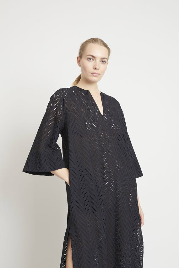 VALLY kjolen er en løstsiddende kjole i en unik stofkvalitet, der giver et karakteristisk udtryk. Kjolen har en rundet halsudskæring med et V-snit, der tilføjer et subtilt og feminint touch til designet.