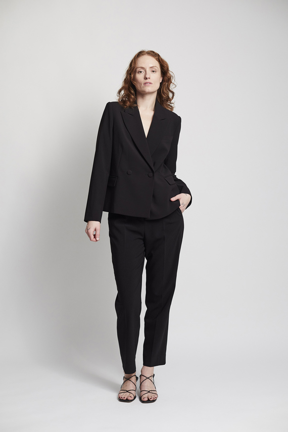 HMJasin blazer er en kort, figursyet blazer med markeret revers, enkelt knaplukning og diskrete frontlommer. En elegant fortolkning af klassisk tailoring.
