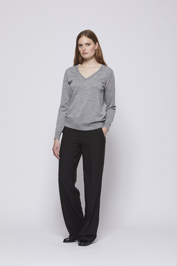 HMKela strik er en bluse i blød merinould med V-udskæring og fine ribkanter. En afbalanceret silhuet med subtil signaturdetalje på skulderen.