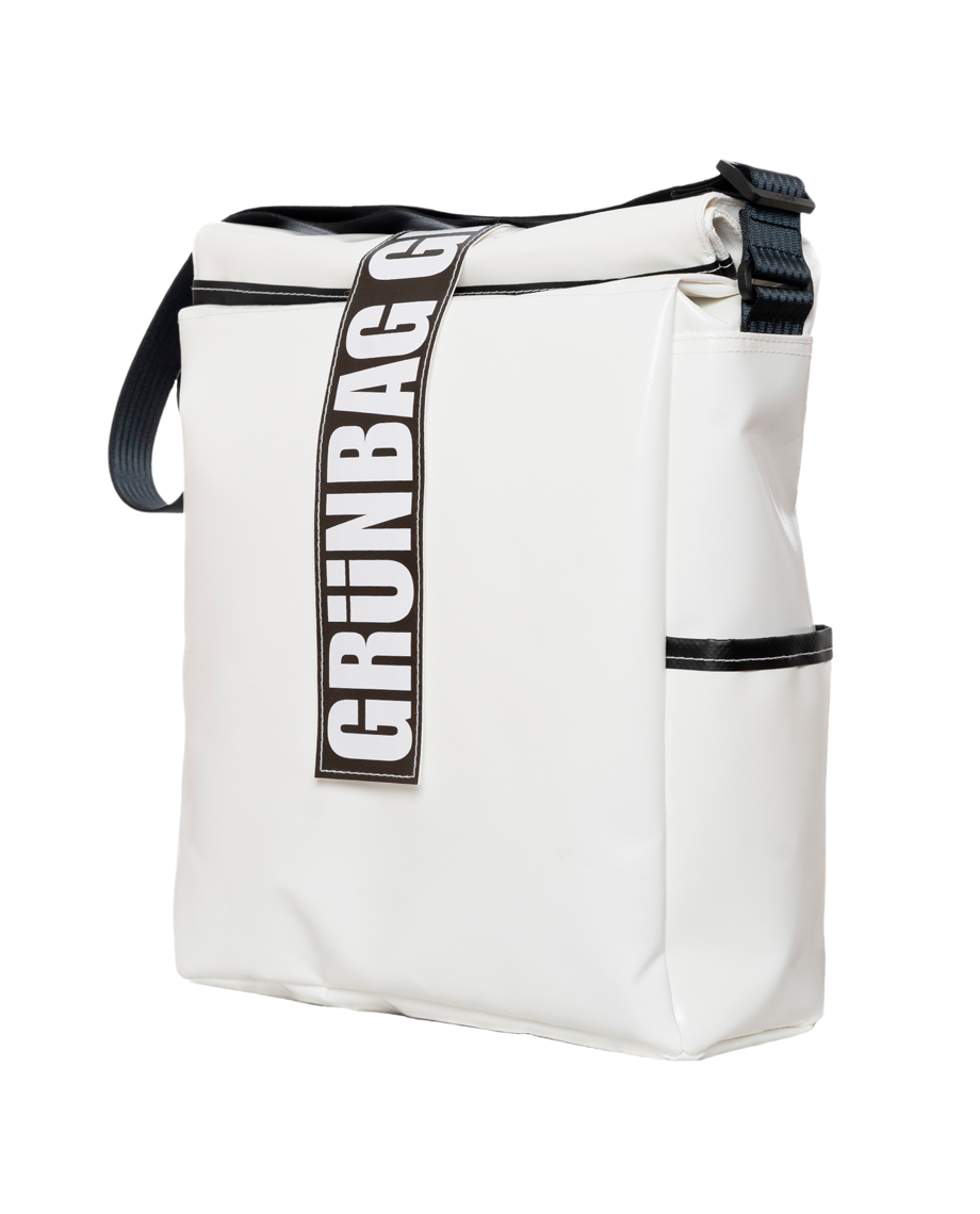 GRÜNBAG Arkitekttaske Hvid arkitekttaske designet med travle arkitekters daglige brug i sigte. Tasken kan indeholde ringbind og A3-format og er ideel til at have over skulderen til møder såvel som på byggepladser. Der er tre indvendige lommer; en til laptop og to mindre lommer til mobiltelefon, skriveredskaber og andre små ting. Desuden har tasken to udvendige lommer. Skulderremmen er lavet af genanvendte sikkerhedsbælter fra biler. Hvid arkitekttaske i stærkt og bæredygtigt design Skuldertasken er lavet af restmateriale fra pressenningproduktionen i Danmark. Vi indsamler det materiale, som bliver skåret fra, når forskellige virksomheder producerer pressenninger til lastbiler og partytelte. Materialerne har derfor aldrig været i brug, hverken på de europæiske motorvejer eller til diverse havefester og festivaler. Materialerne er kasserede fordi de er fraklip og rester. I vores øjne er de helt ubrugt
