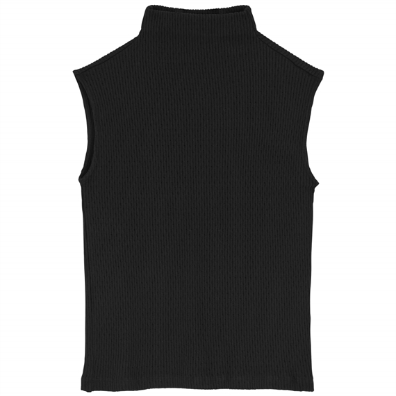 Toppen har et klassisk, ærmeløst snit med en let opretstående krave, der tilfører et sofistikeret touch. Den sorte farve gør den nem at style – perfekt til både hverdag og mere formelle lejligheder.