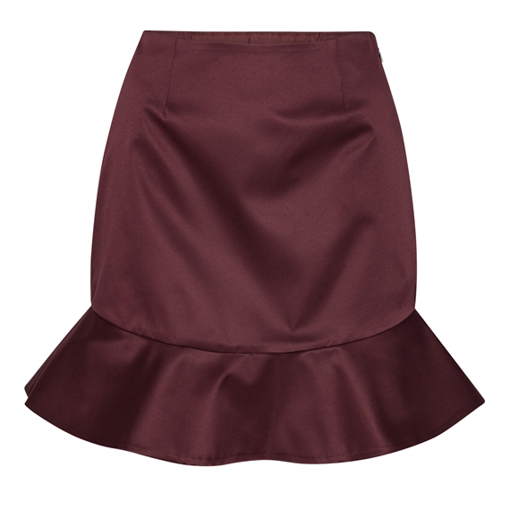 En elegant mini nederdel i en dyb bordeaux nuance, designet i en glansfuld satinfinish. Nederdelen har en figursyet pasform, der fremhæves af en feminin flæsekant forneden, som giver et legende og sofistikeret udtryk. Perfekt til både festlige anledninger og stilfulde hverdagslooks, hvor du vil tilføre garderoben et eksklusivt touch.