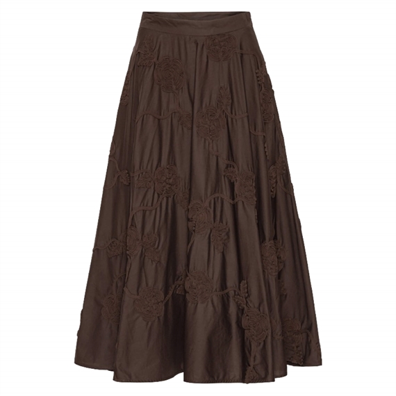 Den smukke Flower Maxi nederdel er denne elegante og romantiske maxinederdel i mørkebrun. Flower Maxi Skirt er designet i blød bomuld og pyntet med håndlavede, tredimensionelle blomsterapplikationer, der giver et eksklusivt og kunstnerisk udtryk.