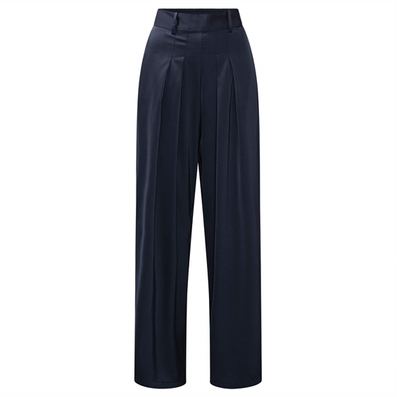 De skønne Blake Bukser fra Karmamia er et par elegante, sorte bukser med høj talje og vide ben, der giver et sofistikeret og tidløst look. De fine pressefolder foran tilfører et skarpt, klassisk udtryk, mens den elastiske linning bagpå sikrer komfort og en flatterende pasform. Perfekte til både hverdagsbrug og festlige anledninger, hvor du ønsker et stilrent og alsidigt outfit.