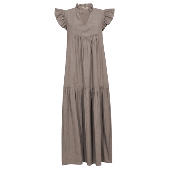 Denne skønne kjole er designet i en let og afslappet silhuet, der falder smukt om kroppen. Den dybe V-udskæring og de fine flæsedetaljer ved skuldrene tilfører et feminint og elegant udtryk, mens den løse pasform sikrer høj komfort hele dagen. Kjolen er fremstillet i 100% økologisk bomuld, som føles blød og åndbar mod huden. Perfekt til både hverdag og sommerlige anledninger - Style den med sandaler for et afslappet look eller med hæle for et mere sofistikeret udtryk.