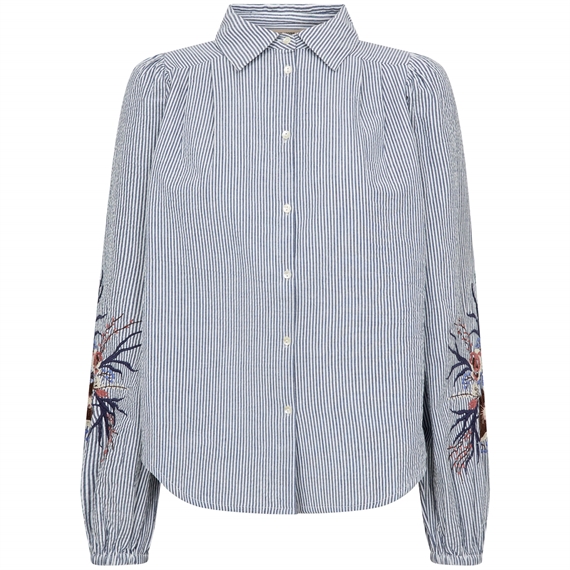 Mos Mosh skjorten fuldendes af en stilren mandarin-krave, lange ærmer og en klassisk knaplukning foran, der giver et rent og moderne look. De smukke broderede detaljer på ærmerne tilfører et unikt og dekorativt præg, mens de let puffede skuldre skaber en feminin og elegant silhuet.