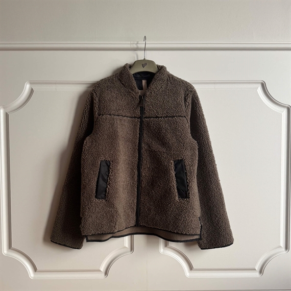 Blød og bamset jakke i en varm brun nuance. Jakken har lange ærmer og er fremstillet i en teddy-kvalitet med en fluffy overflade, der giver et hyggeligt og afslappet udtryk. Den har høj krave, lynlåslukning foran og praktiske sidelommer med kontrastdetaljer. En stilren og komfortabel overgangsjakke, der giver et cool og casual look.
