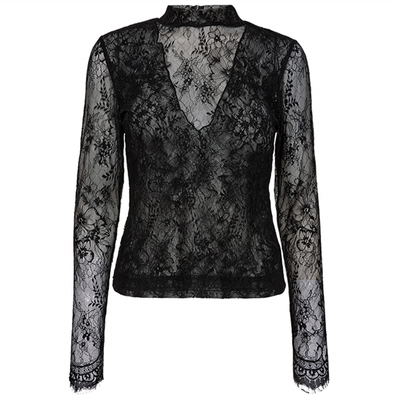 Elegant sort bluse fra Copenhagen Muse i transparent blonde med smukt blomsterbroderi. Blusen har lange ærmer, en lille opretstående krave og en dyb V-udskæring indenunder. Det lette og feminine materiale giver et sofistikeret udtryk, perfekt til både hverdag og fest. Afsluttes med fine blondekanter ved ærmerne.
