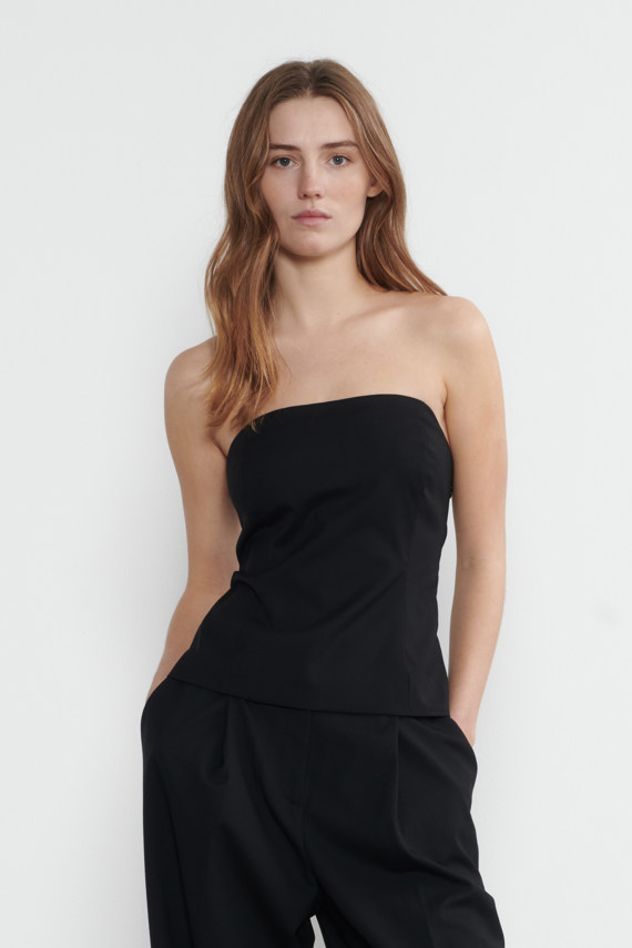 Elegant stropløs top i en eksklusiv uldblanding. Tavin toppen har en tætsiddende pasform, der fremhæver figuren med et minimalistisk og sofistikeret udtryk.