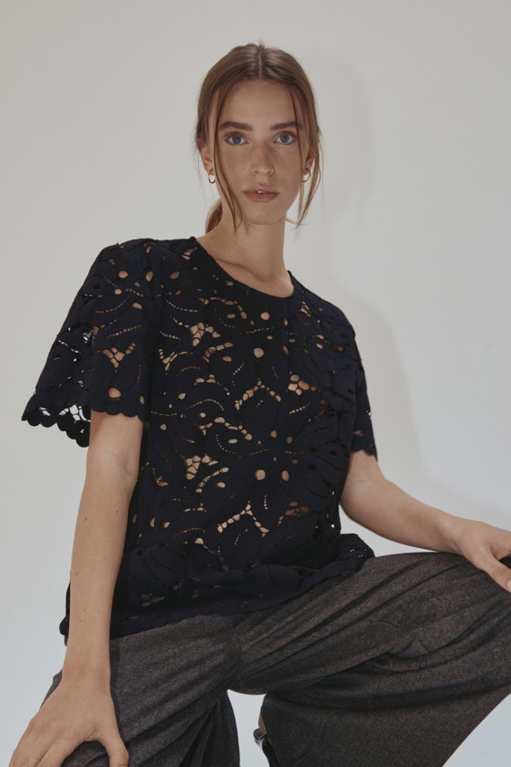 Tusin toppen er en elegant blondetop med smukke detaljer, perfekt til sæsonens festlige lejligheder. Den delikate blonde skaber et sofistikeret og eksklusivt look.