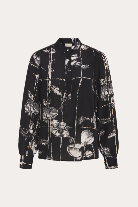 Mesin skjorten er en elegant og eksklusiv skjorte i silke med et smukt grafisk print, der tilføjer et sofistikeret touch til enhver garderobe.