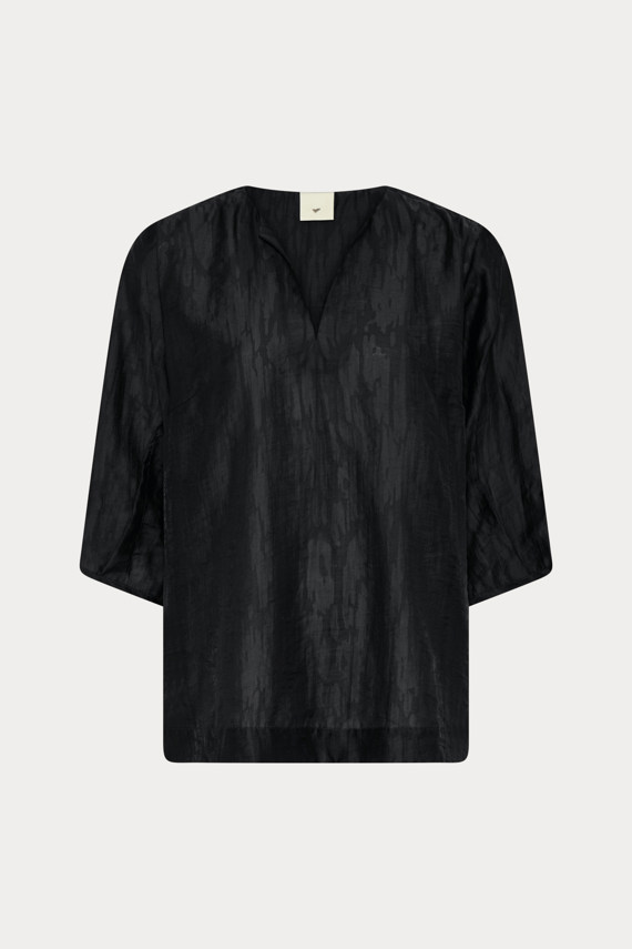 Tailer blusen er en elegant og luftig top med en slank V-udskæring og fine detaljer som bærestykke og læg på ryggen.
