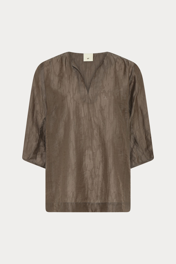 Tailer blusen er en elegant og luftig top med en slank V-udskæring og fine detaljer som bærestykke og læg på ryggen.