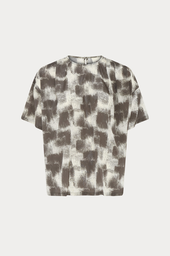 Tanea toppen er en sofistikeret silkebluse med let oversize pasform og smukke draperinger ved skuldrene, der skaber et elegant udtryk.