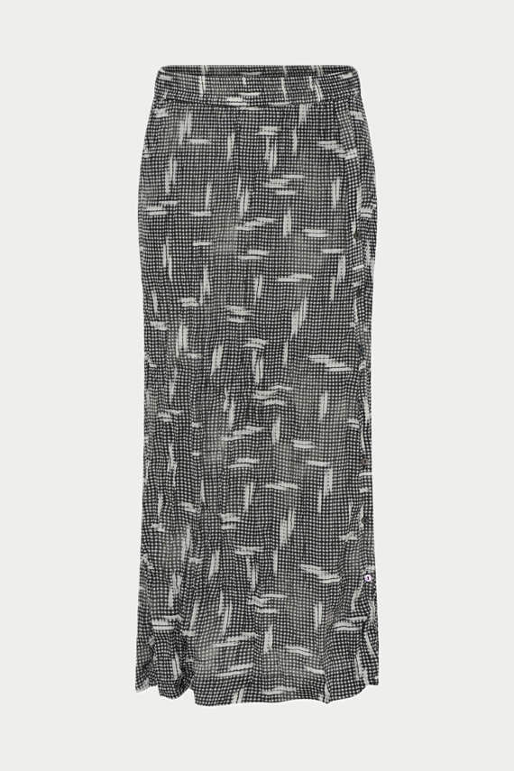HM656Sanis nederdelen er en lang nederdel i strækbar silkekvalitet, der kombinerer elegance med komfort. Den har en elastikbånd i taljen, som sikrer en behagelig og fleksibel pasform hele dagen. Nederdelen er fremstillet med en særlig twist-teknik, der tilføjer et unikt og raffineret udtryk til designet, og den har også en knaplukning langs forsiden, der giver mulighed for at tilpasse udseendet efter behov.