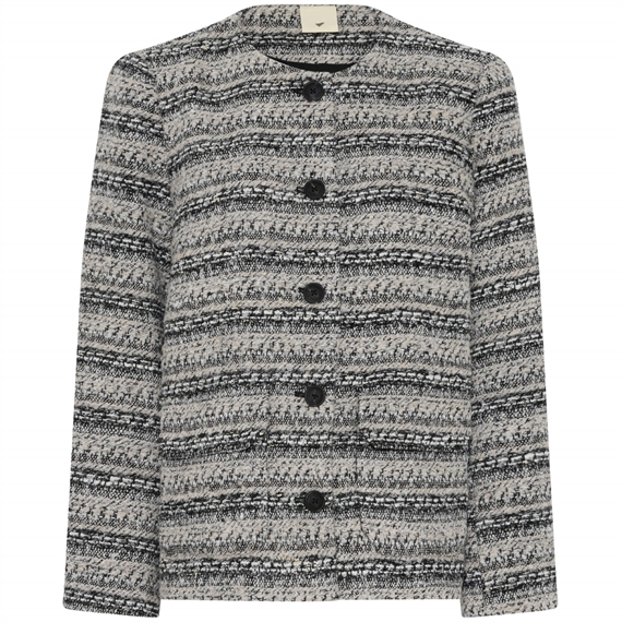 HMJaper jakke er en kort, struktureret jakke med rund halsudskæring, frontlommer og markerede skuldre. En moderne fortolkning af det klassiske bouclé-udtryk.