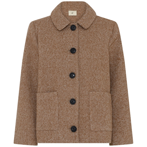 327HMRuea jakke er en kort jakke med klassisk krave og store frontlommer. Det vævede uldmiks giver struktur og varme med et roligt, sofistikeret udtryk.