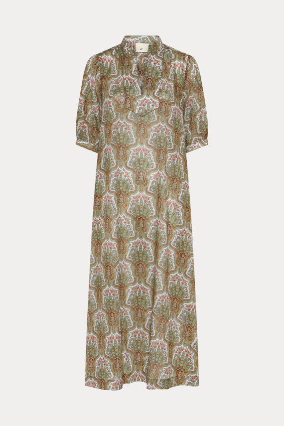 427HMHeliva dress is a long, lightweight dress with a relaxed silhouette, short sleeves, and a soft stand collar, where the paisley-inspired print creates a calm, fluid expression. Style it with flat sandals for an effortless, relaxed look, or add a light knit for a softly layered feel. Pair it with a simple bag to let the print remain in focus. - Long, relaxed silhouette - Short sleeves - Soft stand collar
