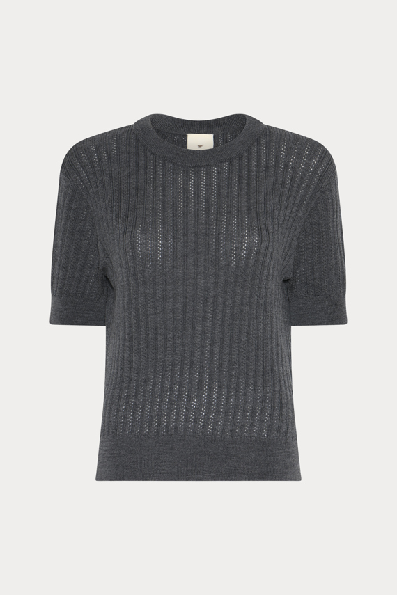 787HMKino knit is a finely knitted top with short sleeves, a round neckline and a refined rib pattern featuring subtle perforated detailing, adding lightness without being sheer. The fit is relaxed and drapes beautifully along the body. Style it with loose-fitting trousers for a modern, effortless look, or use it as a base under a blazer for a sharper styling. It also pairs perfectly with both A-line and maxi skirts for a feminine touch. - Fine knit quality - Round neckline - Short sleeves - Rib and textured knit