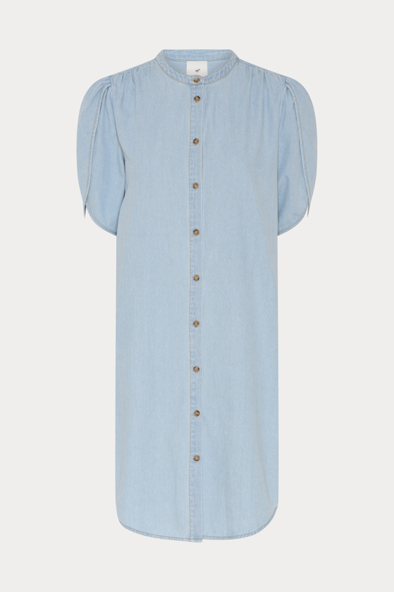 469HMHerle dress is a straight, knee-length denim dress with a stand collar, rounded shoulders, and short puff sleeves that create a soft, structured expression. Style it with sandals for a light, relaxed look, or layer it over slim trousers for a calm, balanced silhouette. - Straight, knee-length fit - Stand collar - Short puff sleeves with rounded shape - Front button closure