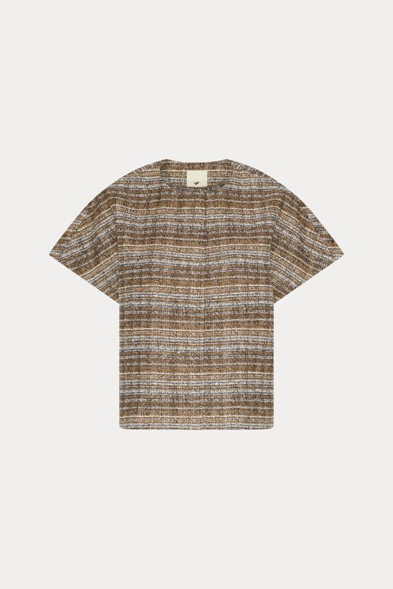 428HMBesea cape is a short, boxy cape with a rounded shoulder line, concealed closure, and a light woven structure with a graphic striped effect. Style it with black trousers for a clean contrast, or layer it over a simple top to highlight the cape’s texture and silhouette. - Short, boxy fit - Concealed button closure - Rounded shoulders - Woven structure with striped effect