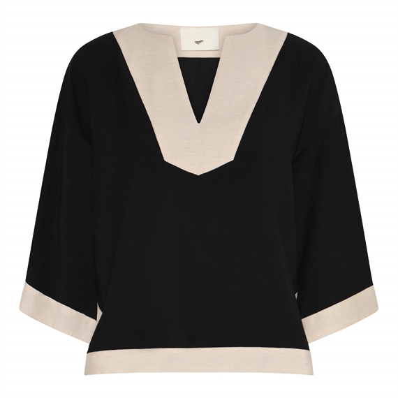 Tarik-skjorten er en kortærmet skjorte med en markant kontrastkant i form af en flot v-udskæring og en løs, skulpturel silhuet, der skaber et roligt grafisk udtryk. Style den med de matchende bukser for et sammenhængende sæt, eller kombiner den med denim jeans eller en flot buks med brede ben for et mere afdæmpet look. Den fungerer også godt lag-på-lag over en enkel top for et let struktureret udtryk.