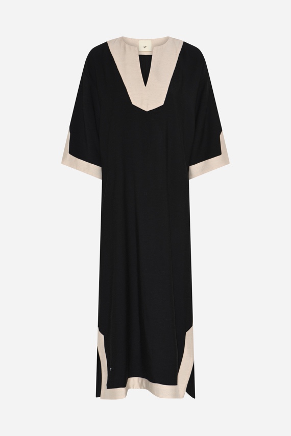 510HMVigdis dress is a long dress with a contrast trim, a deep V-neckline, and a loose rounded silhouette that creates a calm, sculptural expression. Style it with simple sandals for an effortless summer look, or add a light knit for a softly layered, balanced feel. It also stands beautifully on its own as a graphic statement with its bold contrast detailing. - Long, relaxed silhouette - Deep V-neckline - Short, wide sleeves - Contrast trim