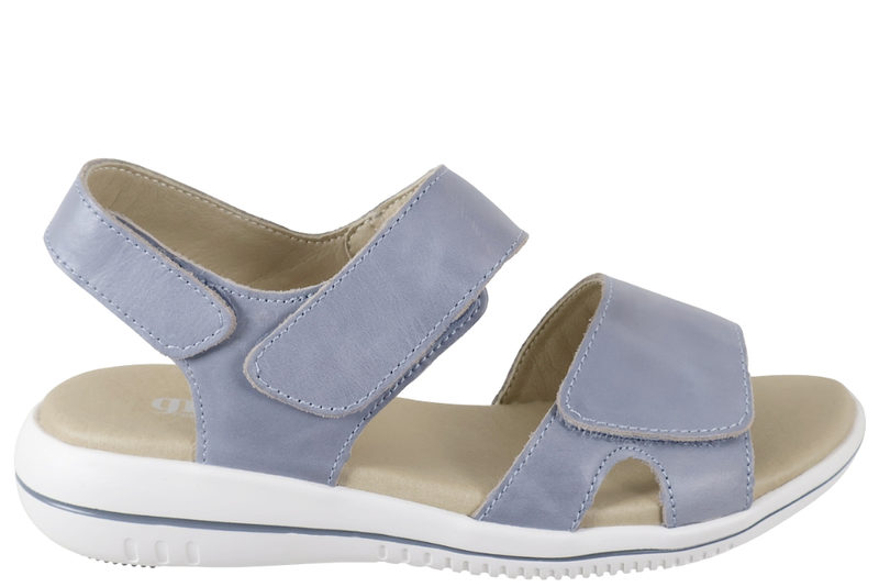 GREEN COMFORT LEAF. Super smart sandal fra Green Comfort. Sandalen er lavet i farven light blue glat skind. Sandalen har tre velcroremme, en over vristen, forfoden og omkring hælen, så den let kan justeres og tilpasses efter foden. Sandalen har en hvid slidsål, der måler 3,5 cm. Indvendigt er skoen foret med farven grå Softtex og har en dæksål på 6 mm. så den er blød at gå med. Sandalen er med stødabsorbering. Alt i alt en rigtig smart sandal med en kanon pasform. .. Læs mere på https://www.juul-sko.dk/damesko/sandaler/green-comfort-0-0-str41.htm