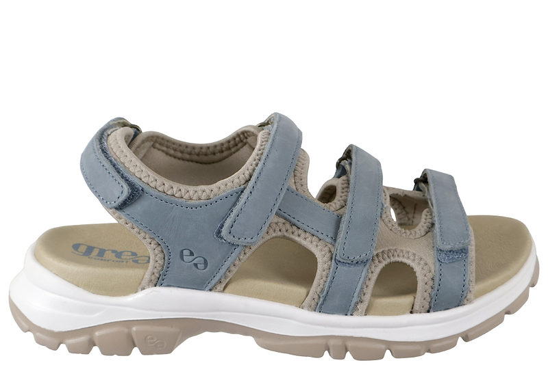 GREEN COMFORT KIRUNA. Light blue sandal fra Green Comfort til damer. Modellen er lavet i olieret skind. Sandalen har fire velcroremme, en rundt om hælen og tre over forfoden, så den kan spændes godt ind til foden. Sandalen er med den kendte Green Comfort sål med svangstøtte og giver en super god støtte. Mellemsålen er hvid, og slidsålen er lavet i taupe gummi med et godt mønster, så man står godt fast. Super god sandal med en kanon komfort. .. Læs mere på https://www.juul-sko.dk/damesko/sandaler/green-comfort-425-1241-str39.htm