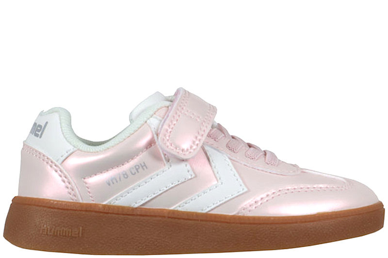 HUMMEL VM78 CPH METALLIC JR. Super smart sko fra Hummel til børn. Skoen er lavet i lyserødt metallisk PU med sølv detaljer. Op langs vristen har skoen elastik snørebånd, som gør at skoen sidder godt fast på barnets fod. Ved insteppet har skoen et lyserødt metallisk velcrobånd, som gør skoen let at komme i og af for barnet. På inder- og ydersiden har skoen de velkendte hummel-pile i hvid. Indvendigt er skoen foret med hvidt tekstil og har en hvid dæksål i tekstil. Slidsålen er lavet af naturfa.. Læs mere på https://www.juul-sko.dk/boernesko/boerne-kondisko/piger116/hummel-16295-str33.htm