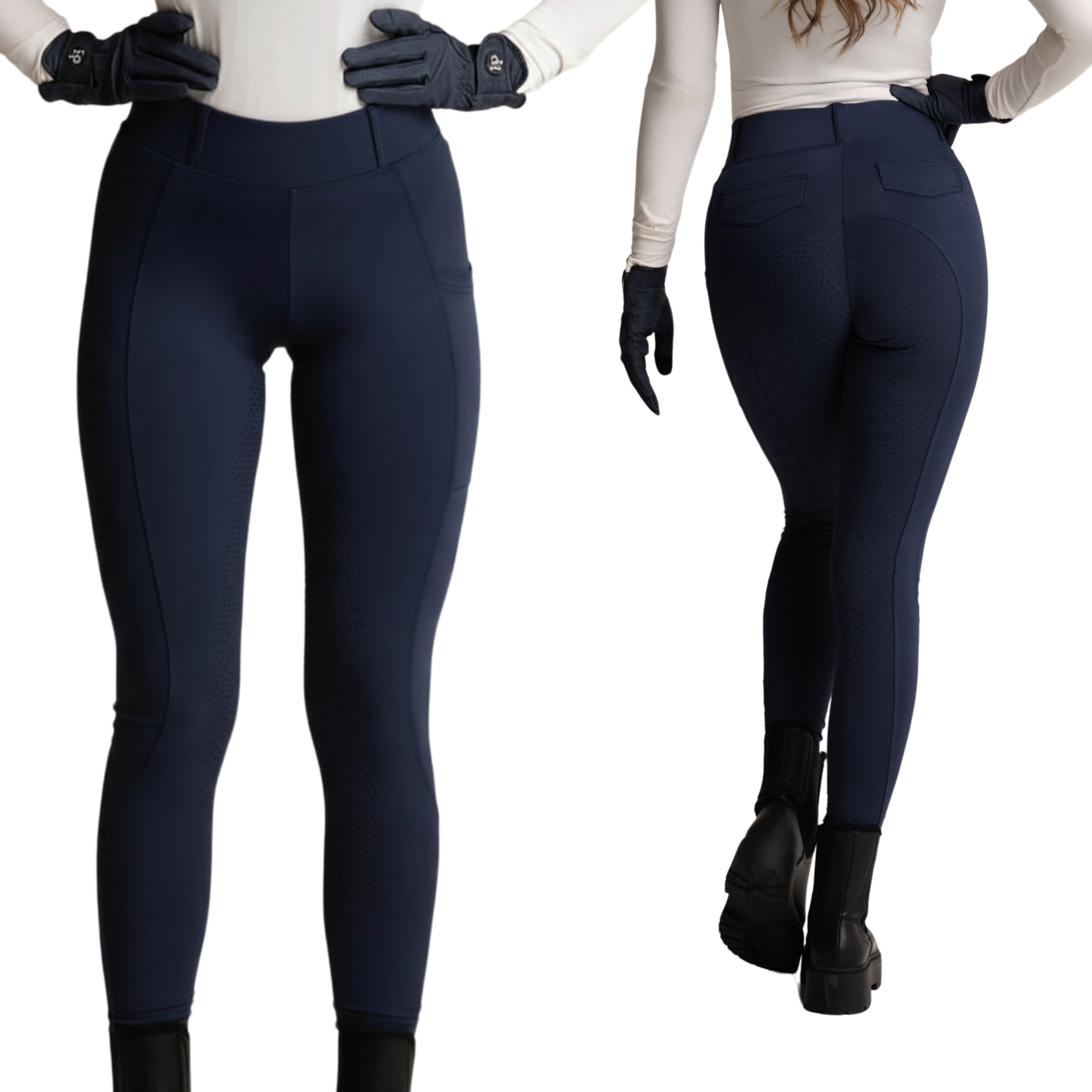 EP Elená i Navy blå – Ultimativ ridetights der giver bevægelsesfrihed og teknisk performance med full grip Oplev den perfekte balance mellem følelsen af dine yndlings-træningstights og de tekniske krav fra ridning. EP Elená er skabt til rytteren, der nægter at gå på kompromis med komforten. Tightsene er fremstillet i et ultralet, genanvendt materiale med 4-vejs stræk, der giver en smørblød pasform. De følger dine bevægelser så naturligt, at du næsten glemmer, du har dem på – uanset om du er i sadlen, i stalden eller i fitnesscentret. Hvorfor du vil elske EP Elená: Vejrbestandig komfort: Materialet er både vandafvisende og hurtigtørrende, så du forbliver tør og komfortabel i skiftende vejr. Avanceret Full Seat Grip: Vores nyeste silikone-teknologi sikrer dig optimal stabilitet i sadlen uden at fjerne den lette, fleksible følelse. Smart opbevaring: De dybe, strategisk placerede mobillommer holder din telefon sikkert på plads, så den aldrig generer dig, når du rider. Elegant finish: Designet med bæltestropper og dekorative baglommer for et klassisk look, kombineret med moderne funktionalitet. Pasform: High-waist med indvendig silikone i taljen, så de bliver siddende præcis, hvor de skal. Lommer: Åben lårlomme, der nemt rummer selv store smartphones. Grip: Fuld silikonegrip for maksimal kontakt med sadlen. Detaljer: Diskret Equestrian P silikone-logo langs højre lomme. Materiale: 78% genanvendt polyester, 22% elastan – et bæredygtigt valg med høj ydeevne. Vaskeanvisning For at passe bedst muligt på dine tights og silikone-grebet anbefaler vi: Maskinvask ved 30° (kold vask). Lufttørring eller tørretumbling ved meget lav varme. Undgå skyllemiddel og strygning.