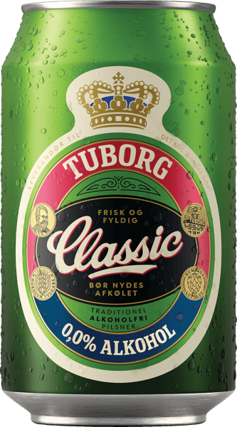 - Alkoholfri pilsner, 0,0% vol. - Øllen har en smuk ravgylden klar farve og et perlende råhvidt skum - Blød og forfriskende fylde med en velbalanceret sødmefuld smag. - Perfekt til den hyggelige fordybede samtale over middagsbordet - Nydes bedst ved 5-11 °C Tuborg Classic 0,0% er en alkoholfri øl med en smuk ravgylden klar farve, god livlighed og et perlende råhvidt skum. Mundfornemmelsen er blød og forfriskende fulgt af en velbalanceret sødmefuld smag. Duften er rig på maltduft med karamelliserede noter og en bagvedliggende mild frugtighed. Tuborg Classic 0,0% er en ægte klassiker med bundsolid kvalitet og en tidløs maltsmag og elegance af balanceret bitterhed. Tuborg Classic 0,0% vinder plads i danskernes hjerter, fordi den rummer alt fra fordybede samtaler ved middagsbordet til røverhistorie på værtshuset og så er den tilligemed uden alkohol. Perfekt til den hyggelige fordybede samtale over middagsbordet. Den bløde maltfylde gør den særligt velegnet til simremad, langtidsstegt kød eller til traditionelle danske stegeretter. Nydes bedst ved 5-11 °C. Tuborg er ikke bare et bryggeri. Tuborg er en kulturinstitution. Tænk bare på sloganet: ”Glædelig jul og godt Tub’år”, der nærmest ved et folkekrav blev til en øl. Eller Grøn Tuborg-annoncen med en tegnet labyrint, der nu i virkeligheden pryder Pile Alle på Frederiksberg. Og hvad med den Store flaske i Hellerup, Grøn Koncert, den Tørstige mand eller Storm P’s vagabonder. Det er ikke det samme uden dig.
