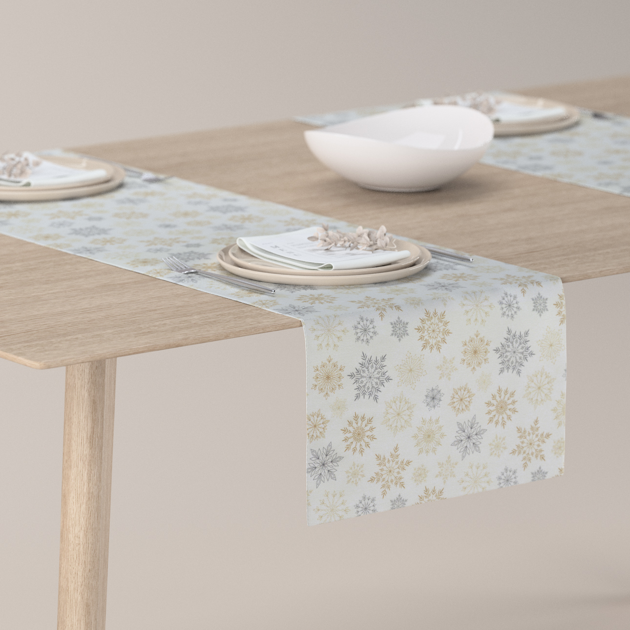 Rektangulær bordløber med bred søm. Brug den som Dinner for 2, hvor du lægger den på tværs af bordet eller som alm. bordløber langs med bordet. Hvis du ønsker et andet mål end 40x130cm, kan du bestille her. Da stofbanerne typisk er 140cm brede, vil bordløbere længere end 130cm blive klippet på langs af stofbanerne, så mønsteret stoffer vil være på langs i stedet for på tværs. Billedet ovenfor viser stof klippet på tværs af stofbanerne.