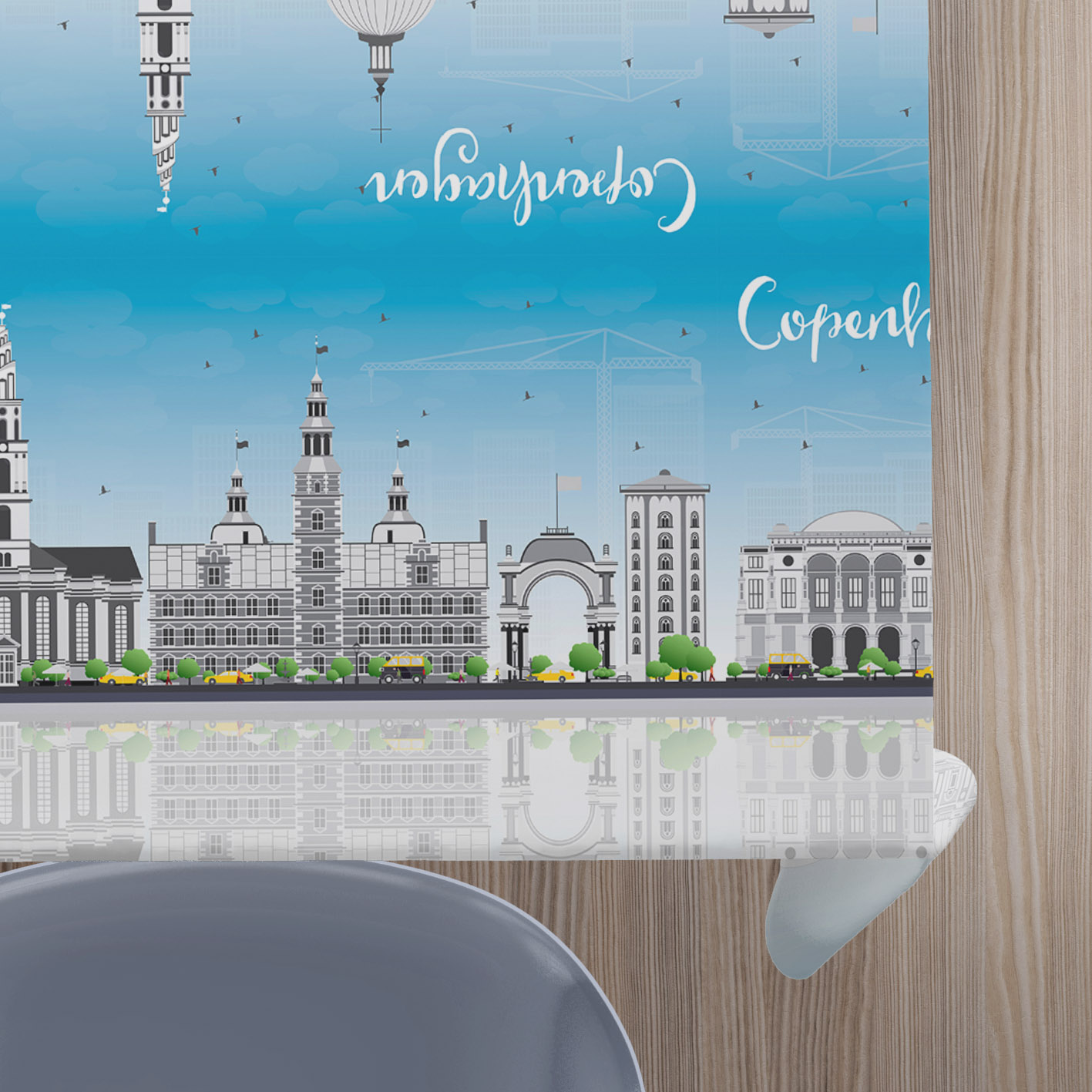 Flot voksdug med bygninger fra københavnVoksdugen viser berømte bygninger i København som kaster deres spejlbillede ud over vandet.