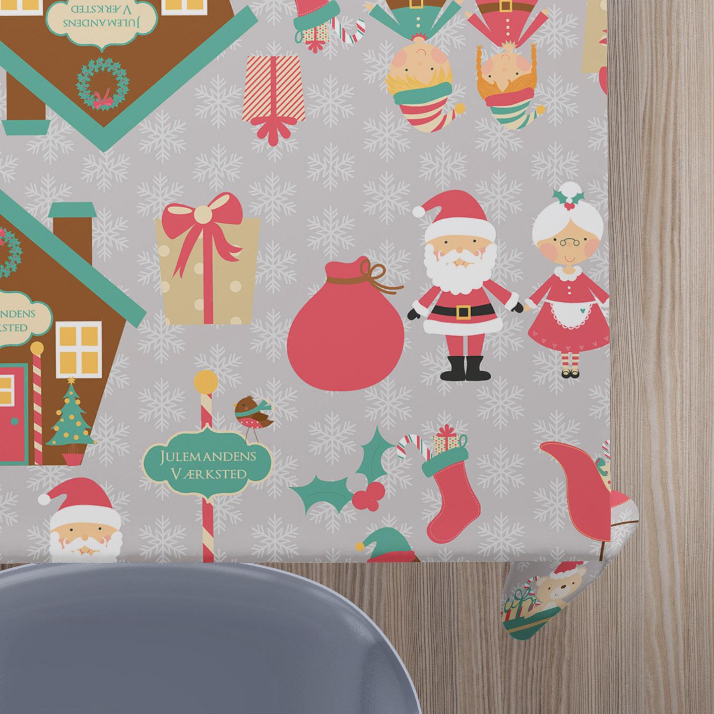 Julemandens værksted er en børnevenlig voksdug i dæmpede og moderne farver. Voksdugen er specielt populær blandt børnefamilier, da den indeholder elmenter som kan underholde hele familien.