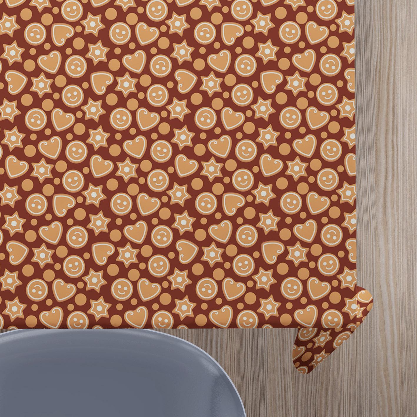 Julevoksdug med hjemmebag. Denne juledug er smukt dekoreret med brunkager på en brunlig baggrund.