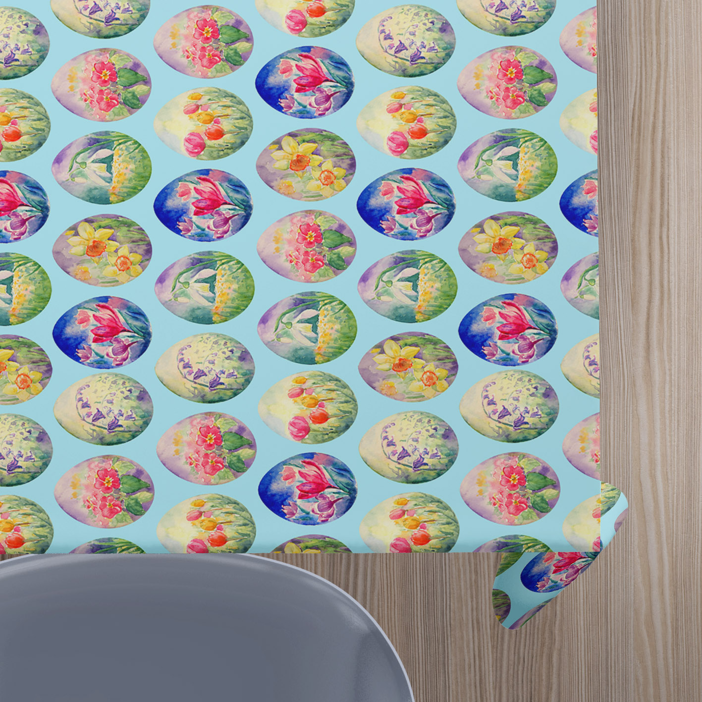 Håndmalet påskeæg - malet med vandfarverDenne voksdug er én ud af en serie på i alt 5 forskellige voksduge. Den eneste forskel på disse påskevoksduge er at baggrundsfarven er forskellig. Farverne er: grøn, hvid, blå, rød og gul / orrange.