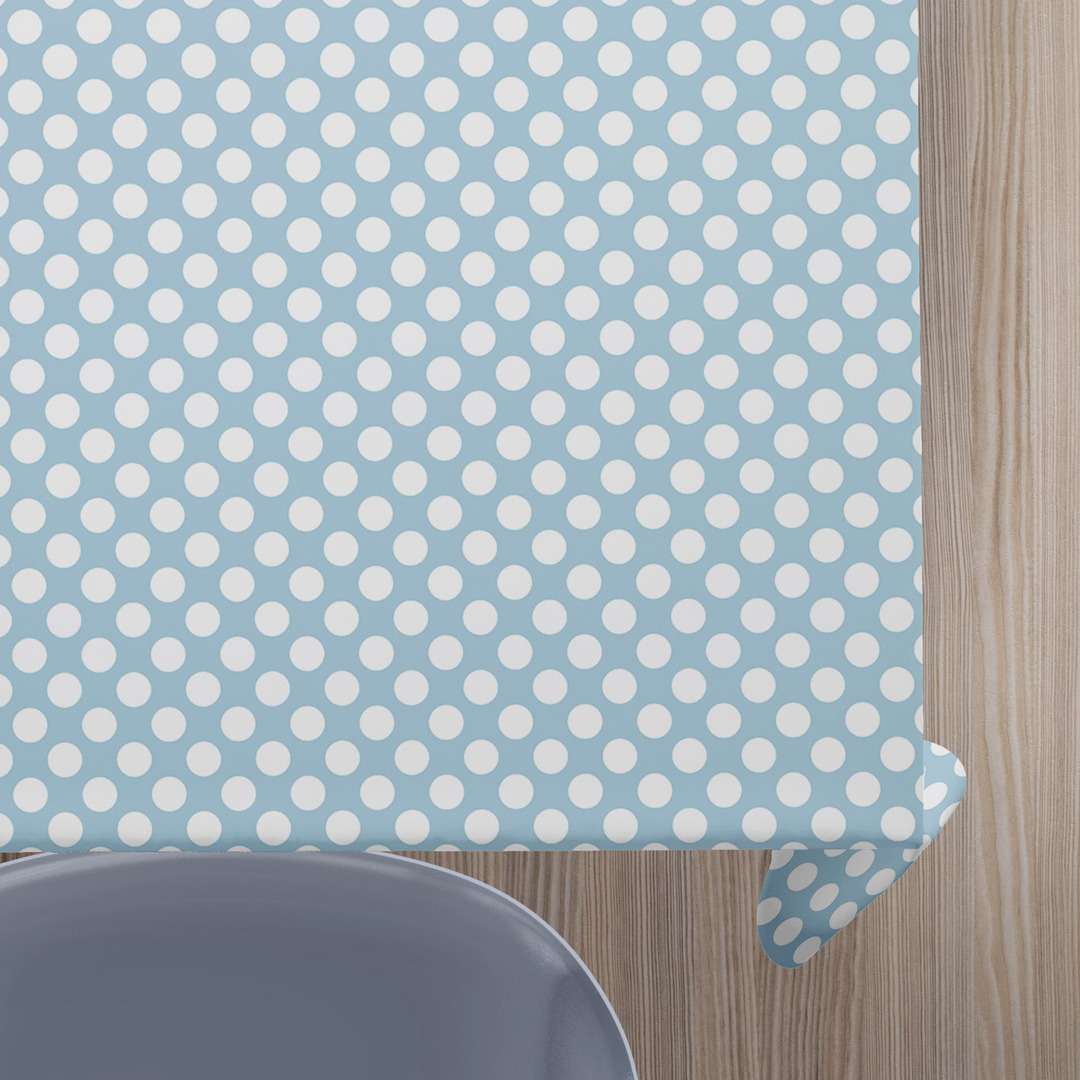Voksdug med prikker - BlåPrikkede voksduge er meget populære. Man kan nemt skabe et udtryk baseret på en eller flere farver, men uden af farven bliver alt for gennemtrængende. Netop her er en farvet voksdug med prikker god, da farven ikke vil "overtage" opmærksomheden, pga af kontrastfarven i prikkerne.