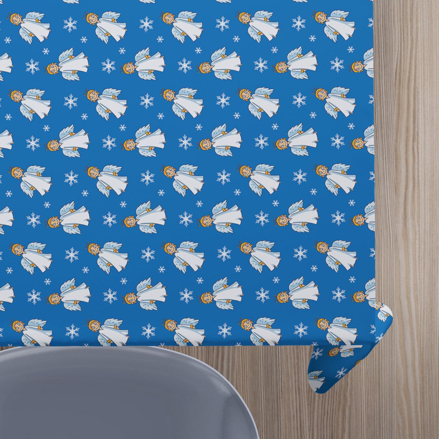 Flot jule-/vinter voksdug med engler på blå baggrund.