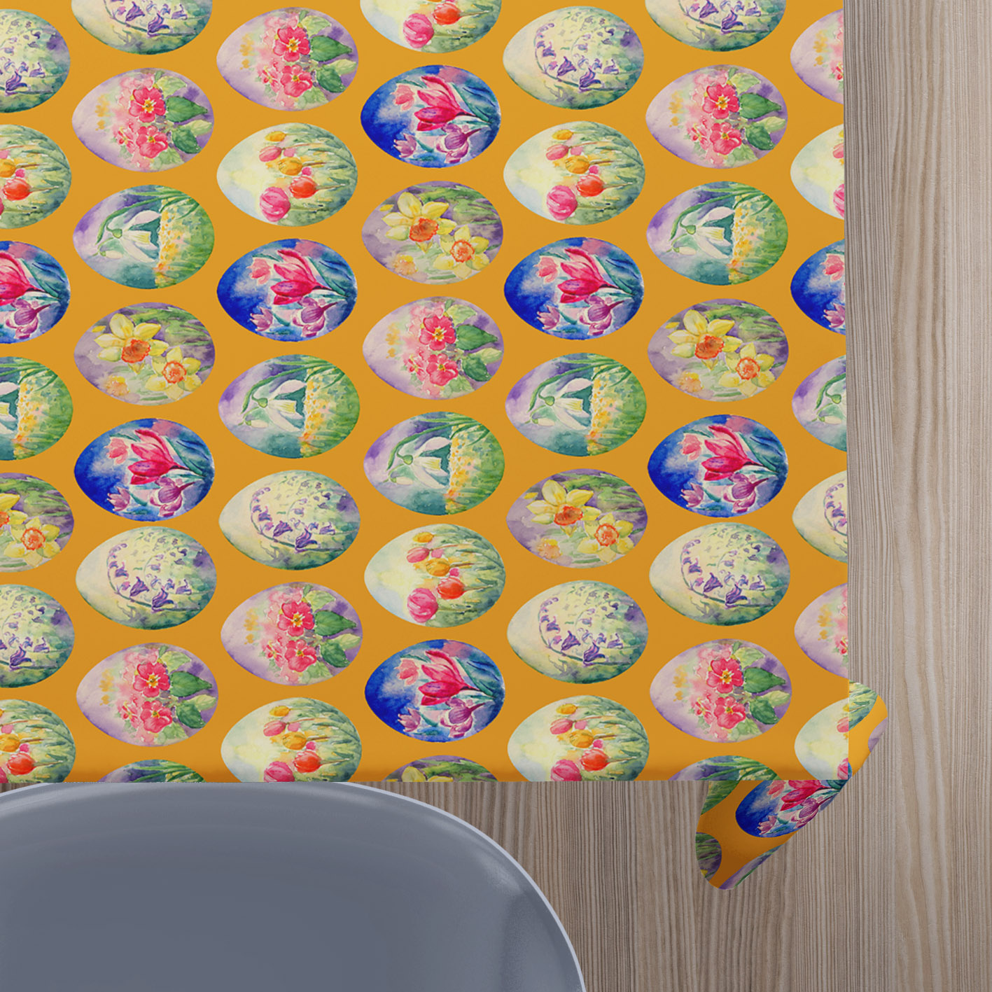 Håndmalet påskeæg - malet med vandfarverDenne voksdug er én ud af en serie på i alt 5 forskellige voksduge. Den eneste forskel på disse påskevoksduge er at baggrundsfarven er forskellig. Farverne er: grøn, hvid, blå, rød og gul / orrange.