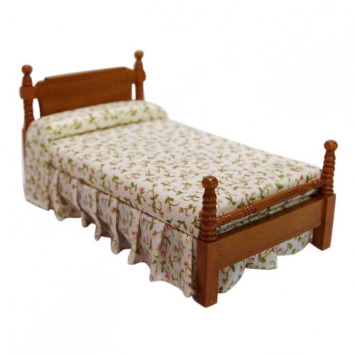 Skøn seng i valnøddetræ flot redt med fint sengelinned.