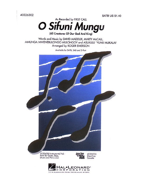 (All Creatures of Our God and King). Now available for men's chorus, this exciting work was recorded by First Call. Based on All Creatures of Our God and King and paired with a powerful African chorus, features fiery syncopations, opportunities for soloists and a full complement of percussion instruments. Awesome!