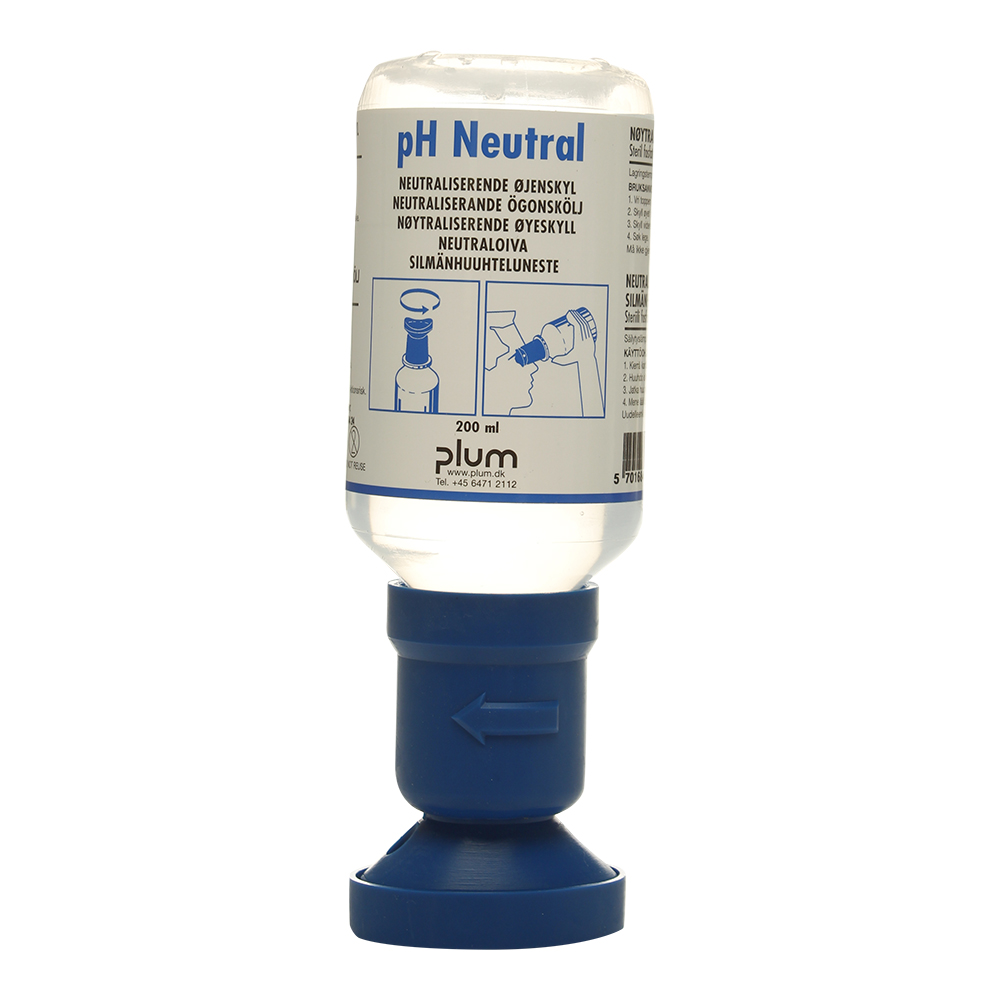 Plum Øjenskyller pH neutral blå 200 ml. Plum varenr. 4752. Til neutralisering af syrer og en række basiske stoffer. Praktisk øjenskyl Uundværlig mange steder Lille og handy flaske Nem at have med i tasken Sikkerhedsløsning til kontorer og arbejdspladser Også velegnet til private Øjenskyller i flaske til at skylle øjet når uheldet er ude. Behagelig, hygiejnisk og meget nem at bruge. Ved uheld med syrer og baser bør øjet skylles ud med denne øjenskyllevæske. Øjekoppen er formet efter øjets naturlige runding. Kan også opsættes i en vægholder Indhold: 4,9 % steril fosfatbuffer. Uåbnet er den sterile væske holdbar i 3 år.