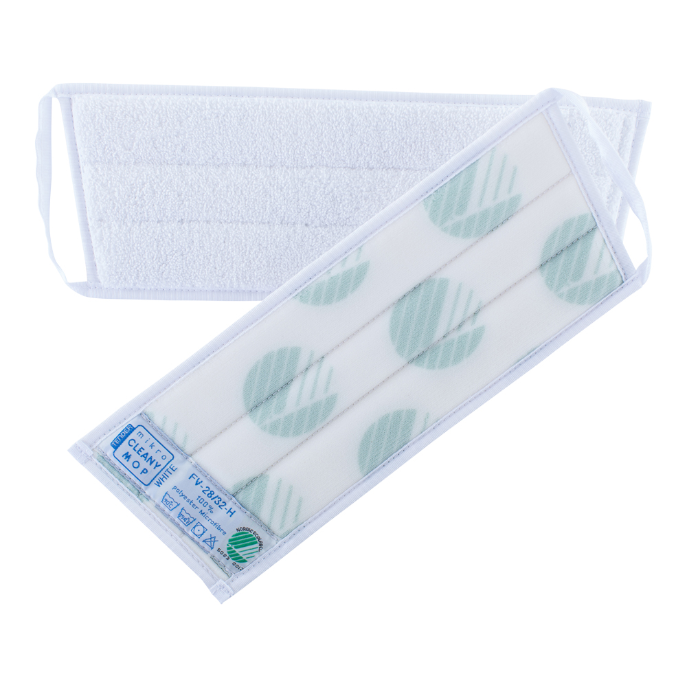 Micro Cleany moppe i hvid, er en microfibermoppe til rengøring af glatte overflader og andet inventar. I tør tilstand genereres en stærk elektrostatisk opladning, som tiltrækker støv og løst snavs. Bruges til whiteboards og andre glatte overflader, men fungerer også godt som tørmoppe. Microfibermoppe Passer til velcrosystemer Bredde: 28/32 cm. Vægt 50 gr. Tåler 500 vaske Til fugtig og tør anvendelse Velegnet whiteboards og andre glatte overflader Svanemærket Den ideelle moppe til rengøring af glatte overflader, borde og whiteboards, 30 cm Lang levetid, høj rengøringsperformance og en bakterieopsamling på 99% Membranen øger absorberingsevnen. Produktet kan tåle klor og sprit pga. den høje råvarekvalitet. Er testet til at tåle sterilisering med autoklave ved 121 grader og 2-3 bar i 30 min. Kan anvendes i tør, fugtig eller våd tilstand. Passer til 30 cm ultralet fremfører, art. nr. 1653002. Lev.varenr. FV-28-32-H
