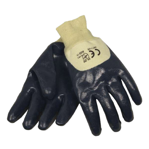 Slidstærk arbejdshandske fremstillet af bomuld og nitril. Halvdyppet nitrilhandske, hvor håndflade og det meste af håndryggen er dækket af nitril. Stærk handske der er velegnet til lettere industri, byggeindustri og auto. Handsken er ikke 100% væsketæt og derfor ikke egnet som kemikaliehandske. Materiale: nitril, bomuld. Størrelse: 8. Farve: blå. Tykkelse: 1,1 mm
