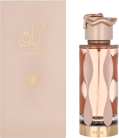 Lattafa Teriaq EDP er en dyb, kompleks og maskulin duft, der er kendt for sin orientalske og krydrede karakter. Denne parfume henvender sig til mænd, der ønsker en intens, rig og langvarig duft, der udstråler både styrke og elegance. Perfekt til aftenbrug og specielle lejligheder, hvor man ønsker at tiltrække opmærksomhed med en kraftfuld duft. Duften åbner med krydrede og aromatiske topnoter, der giver en frisk og intens start. I hjertet findes en blanding af orientalske og træagtige noter, som kombinerer sig med røgfyldte elementer, der tilfører dybde og mystik. Basen er varm og sensuel, med noter af oud, moskus og vanilje, der giver parfumen en langvarig og sofistikeret afslutning. Teriaq EDP er perfekt til den moderne mand, der ønsker en duft, der udstråler både kraft og elegance. Flakonen har et luksuriøst og stilfuldt design, der afspejler parfummens orientalske og luksuriøse karakter.