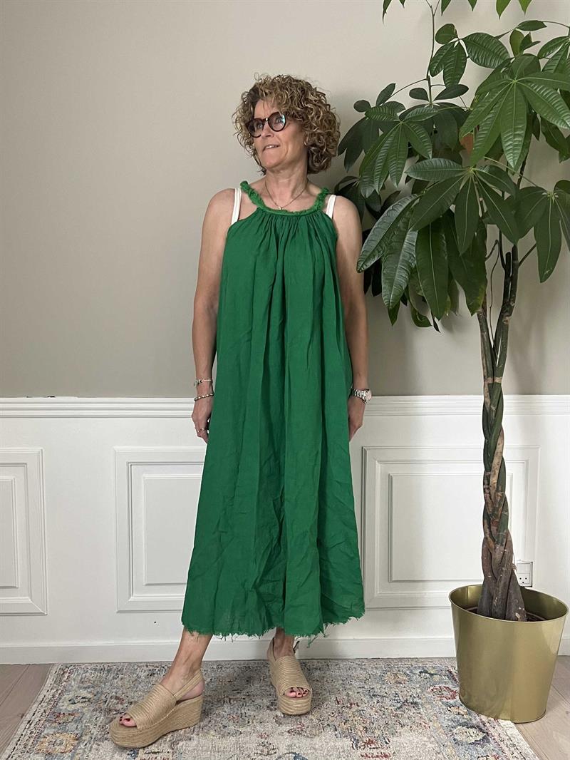 PRODUKTINFORMATION: Cabana Living B1710 Verde Green kjole - Hørkjole Denne feminine kjole fra Cabana Living taler næsten for sig selv. Et helt enkelt snit med rå bånd som falder utrolig flot på skuldrene, kjolen er lavet med rå afslutninger i alle kanter samt i bunden. Kjolen har en lille slids i nakken hvor den lukkes med en lille perlemorsknap, Samt lomme i siden. Mangler din størrelse så skriv endelig til info@newseason.dk, så vil vi undersøge om den kan skaffes hjem. Produkt nummer: B1710 Verde Green kjole - Hørkjole Materiale: 100 % Hør Pasform: Onesize Brystmål: 135 cm. Vidde nedom: 176 Cm. Længe: målt fra skulderen og ned: 137 cm. Farve: Verde Green
